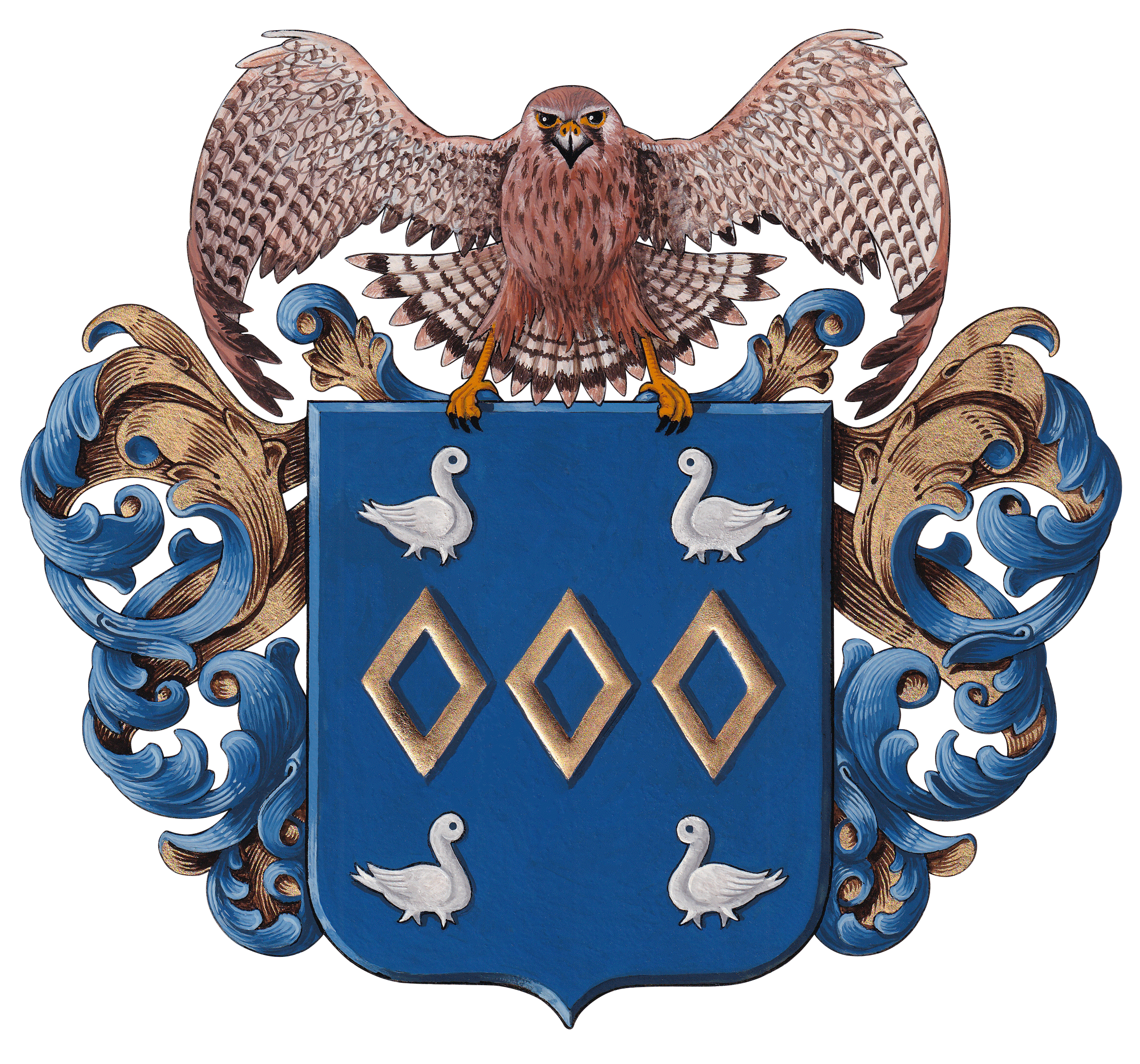 D'azur à trois macles d'or rangés en fasce, cantonné de quatre merlettes d'argent affrontées deux à deux